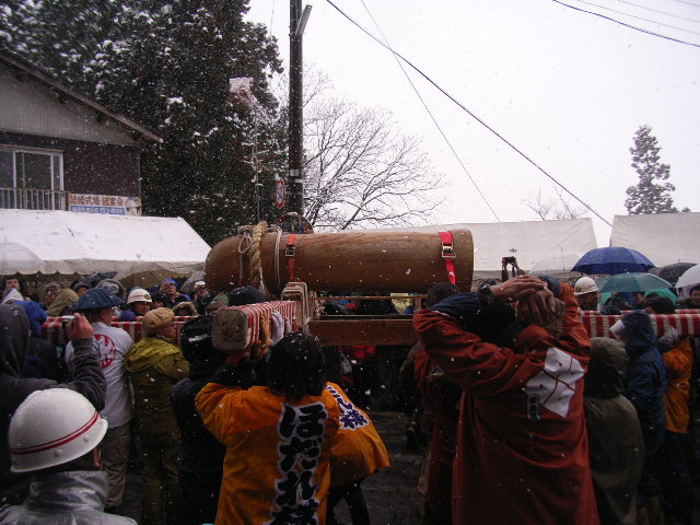 そんなわけで持ち上げて運ぶのは無理なので、もっこで担ぎながらも紅白のコロを使って転がしつつ、慎重に石段の上からおろして行くのだ。