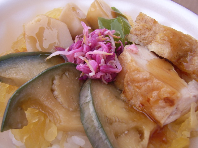 ごはんの上に「長岡巾着ナス・糸瓜・かぐらなんばん・おもいのほか・土垂芋」の5種類の長岡野菜と鶏肉。