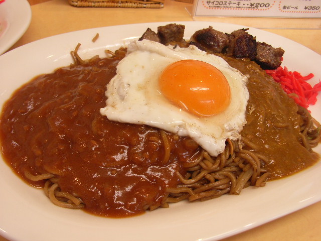というわけでこれが『ミックス焼きそば トッピングめだま&サイコロステーキ』・・・