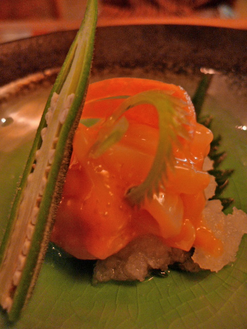 上に盛ってあるややしょっぱめのイカのウニ和えを、下の大根おろしと合わせてチビチビやりながら冷酒で口を洗うと、いかにもな風情があってなかなか良い感じです。