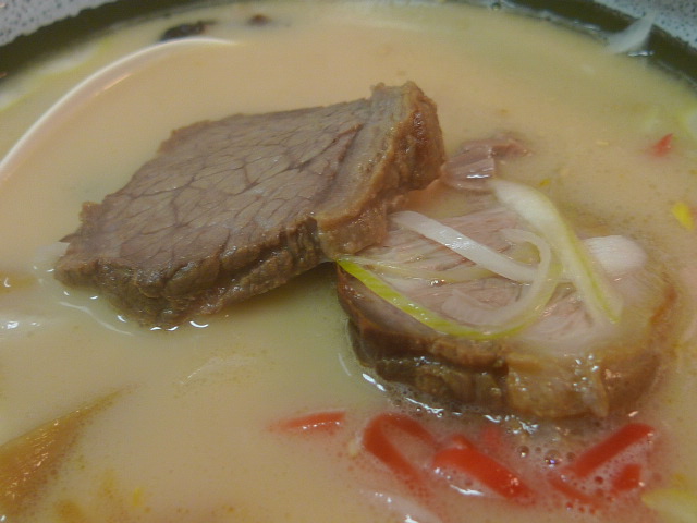 チャーシューは(この店的には)薄切りの豚の柔らかチャーシューが一枚と、写真左側の噛み応えのある牛のチャーシュー?が一枚。