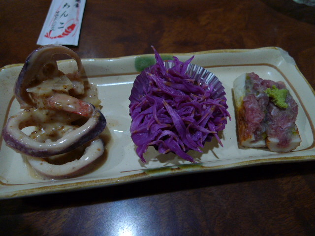 昨日前もってわきさんと「居酒屋 かちんこ」で飲む約束をしてたんだけど、土壇場になって旅行に行っていたヤスから土産を渡したいとの連絡が来て、急遽3人で飲むことになった。