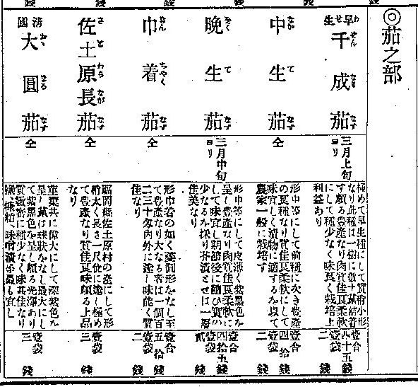 最も永く本邦において栽培し、その名高く且つ多く伝播するもの(有名で広く栽培されているもの)は、丸茄子・銀茄子(白茄子のことらしい)・巾着茄子・百結茄子・早種茄子等にして、近来の舶戴にかかるものは、アーレー・ロングパープル、ブラック・プリンス、ニューヨーク・インブルーブドパープル、ラージ・ブラックペキン、水茄子、大丸茄子、スカーレット・フルーテット等にして、そのなか最も収穫の多きは本邦在来種にては丸茄子・早種茄子・巾着茄子等にて。舶来種にてはラージ・ブラックペキン、ニューヨーク・インブルーブドパープルなり」