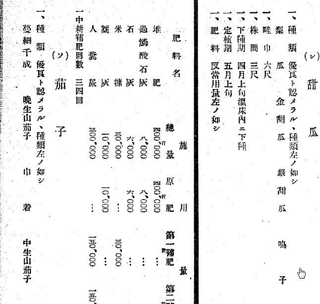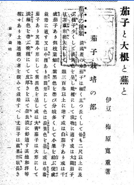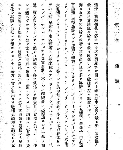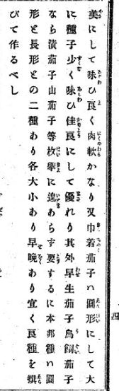 「茄子はその種類甚だ多く、一々これを列挙するあたわずと言えども、就中その肉の最も美に、その収穫の最も多く、その調理において最も便利なるもの数種を左に(ここでは下に)記述すべし。