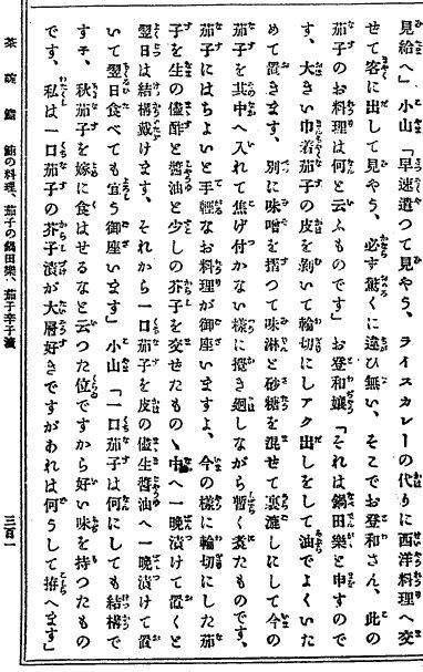 お登和嬢「それは鍋田楽と申すのです。大きい巾着茄子の皮を剥いて輪切りにし、アク出しをして油でよくいためて置きます。別に味噌を摺って味醂と砂糖を混ぜて裏漉しにして、今の茄子をその中に入れて焦げ付かないように掻き回しながら暫く煮たものです。茄子にはちょいとお手軽な料理が御座いますよ。今のように輪切りにした茄子を生のまま酢と醤油と少しの芥子を交ぜたものの中へ一晩漬けて置くと翌日は結構戴けます。それから一口茄子を皮のまま生醤油へ一晩漬けて置いて翌日食べてもよろしゅう御座います」
