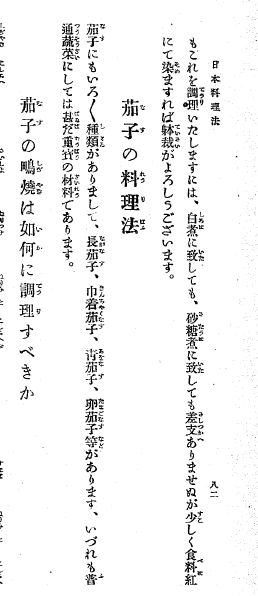 「茄子にもいろいろ種類がありまして、長茄子、巾着茄子、青茄子、卵茄子等あります。いずれも普通惣菜にしては甚だ重宝の材料であります」