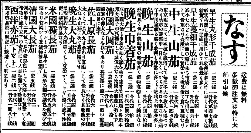 以前「食育の父」とも言われる明治の小説家でジャーナリストでもあった村井弦斎が書いたグルメ小説『食道楽』の作中で「大型の巾着茄子」の料理法が紹介されてるのを読んで以来、「明治の頃は長岡巾着茄子のような大型の巾着茄子は割と一般的なものだったのではないか?」と仮説を立ててた俺は、あわよくばその仮説を証明する手掛かりになるような情報はないかと期待に胸を膨らませて(Eカップくらいに)カタログを開いた。