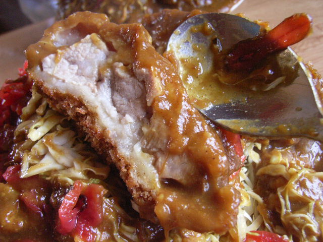 千切キャベツを掻き分け、ようやくごはんに到達すると、今度は厚さ2cmあまりのトンカツのオーバーハングが行く手を阻む。