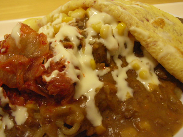 片側の薄焼き卵をめくるとそこにキムチとハンバーグが載っていた。