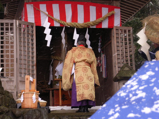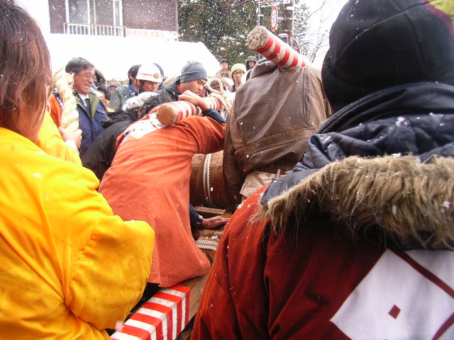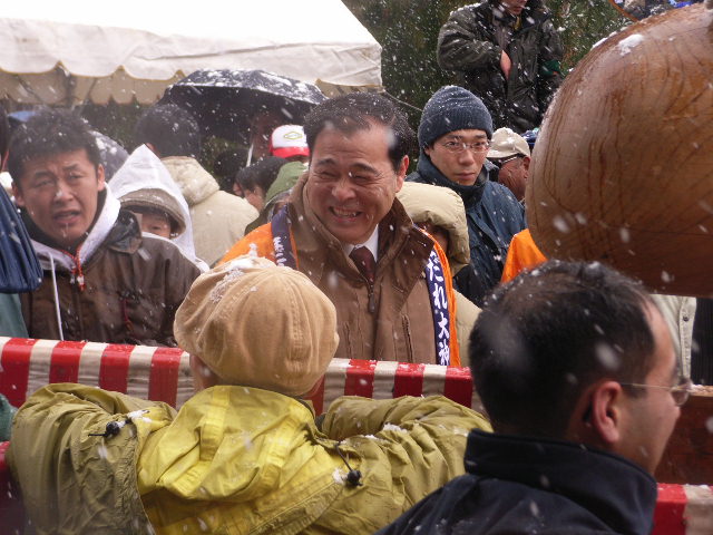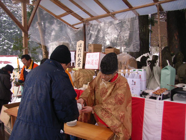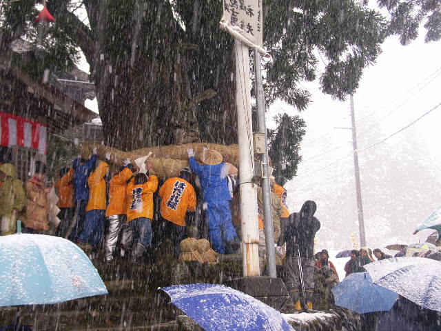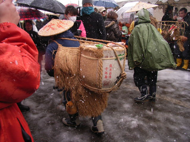 「初嫁厄払い」が終わると、会場である坂道の下のほうから、昔ながらの蓑笠・もっこ姿のおいちゃんがお神酒の酒樽を担いでえっちらおっちら人波掻き分けやってきた。