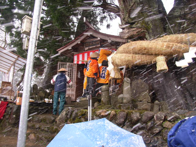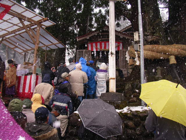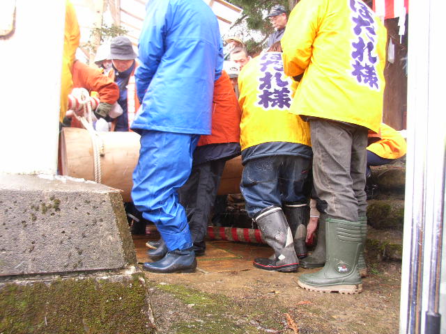 祠の前に大勢の男衆が集まり御神体を運び出す。