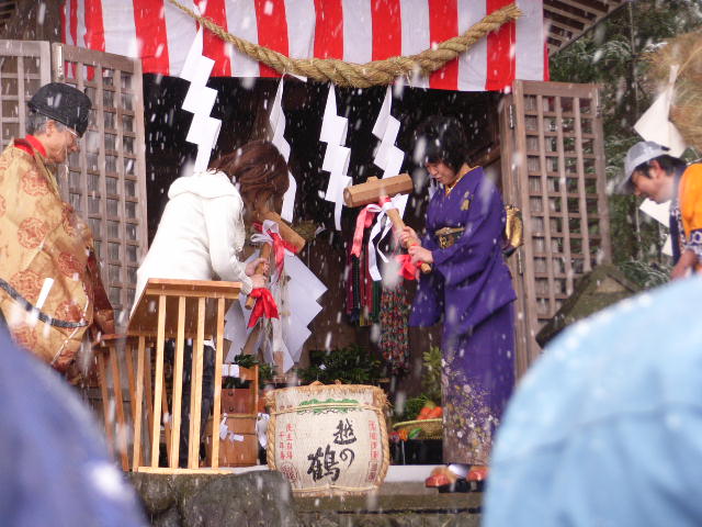 そしてほだれ様の祠前で、初嫁さんによる奉納されたお神酒の鏡開きが行われた。