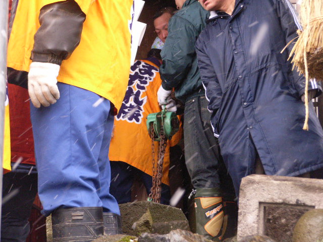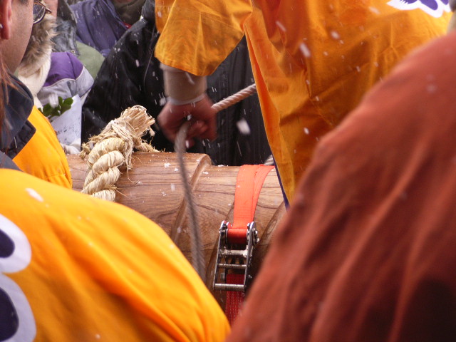 そんなわけで持ち上げて運ぶのは無理なので、もっこで担ぎながらも紅白のコロを使って転がしつつ、慎重に石段の上からおろして行くのだ。